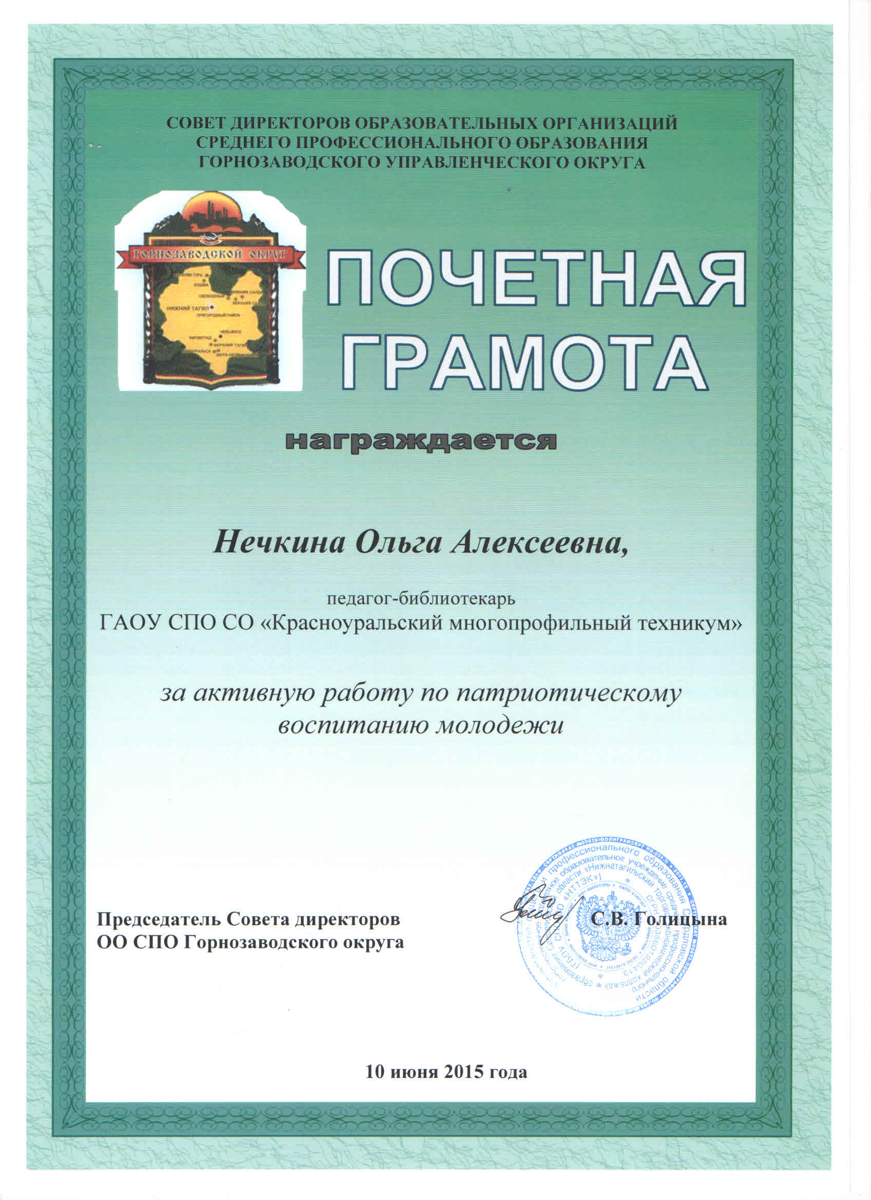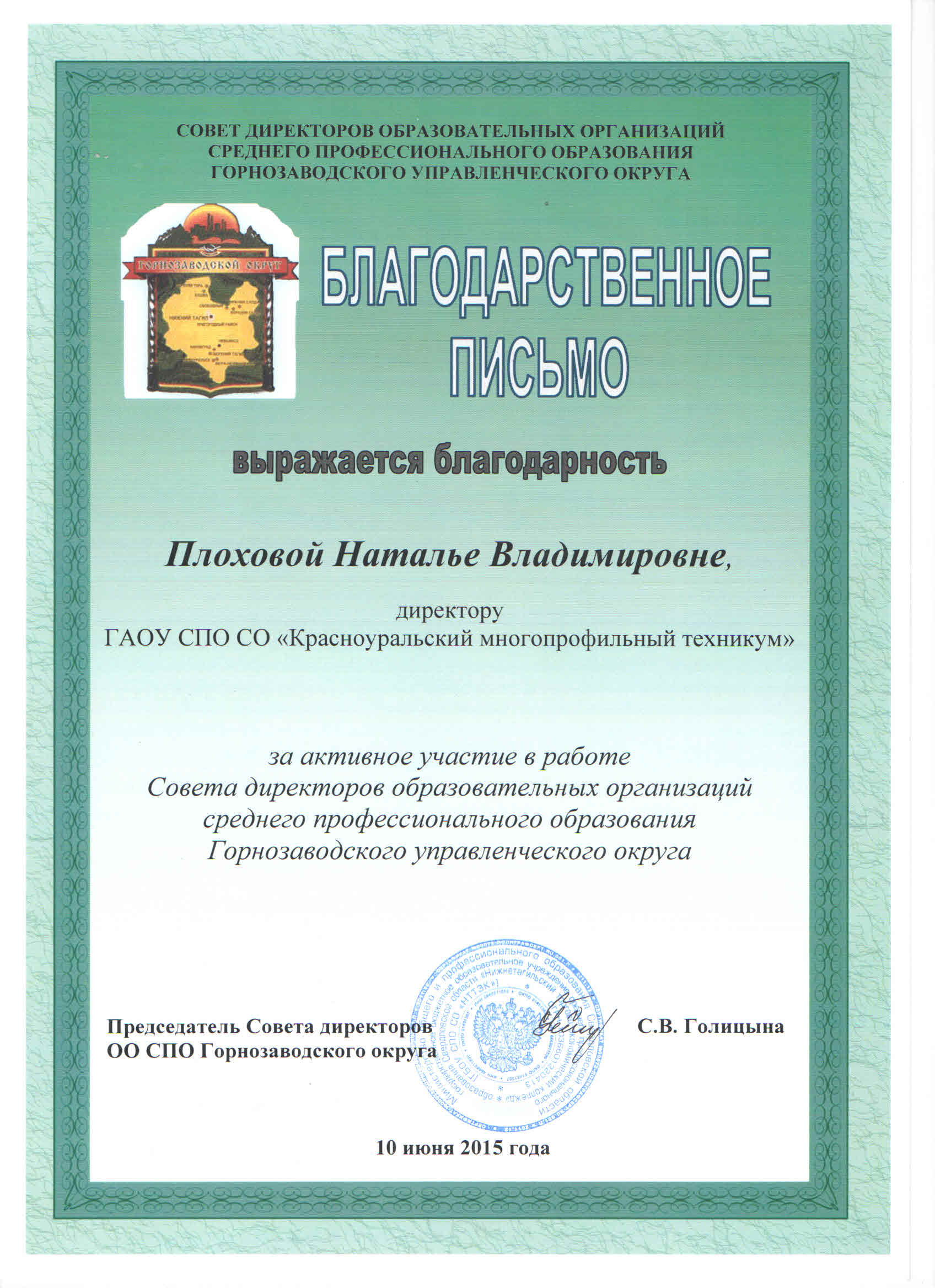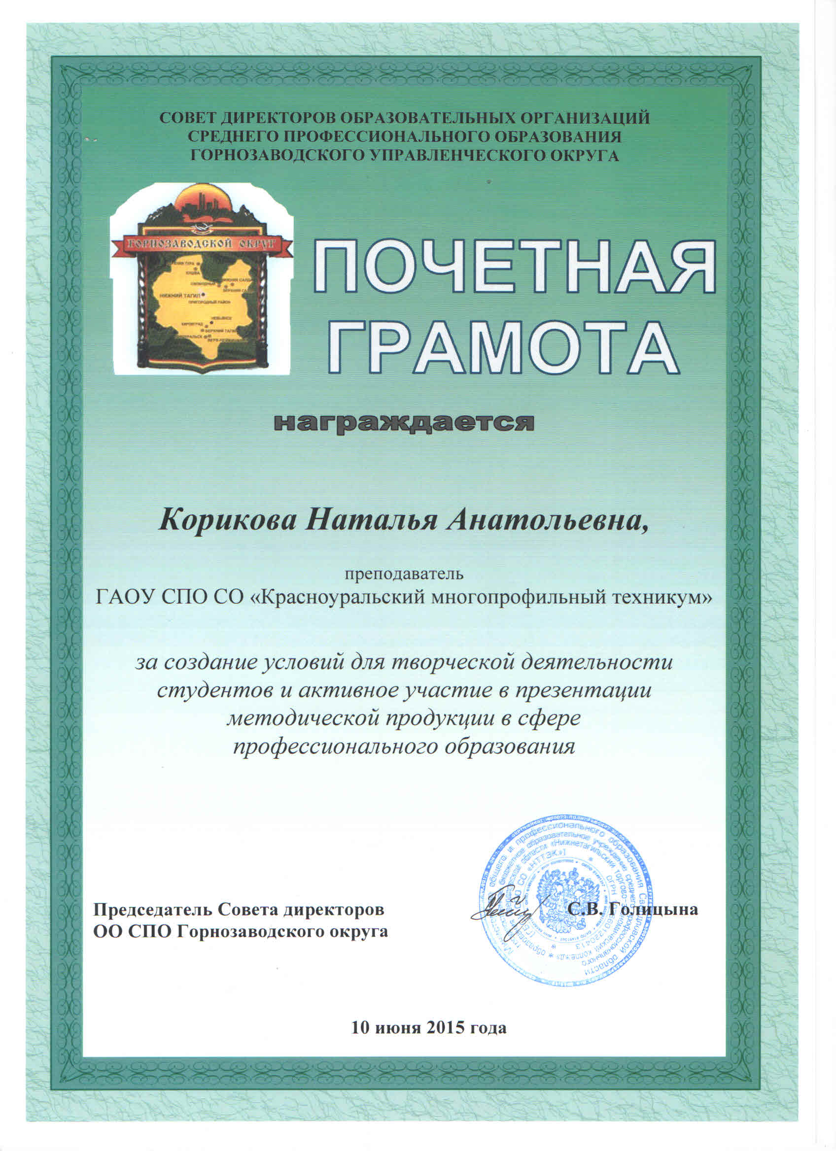 Почетные грамоты от Совета директоров Горнозаводского округа