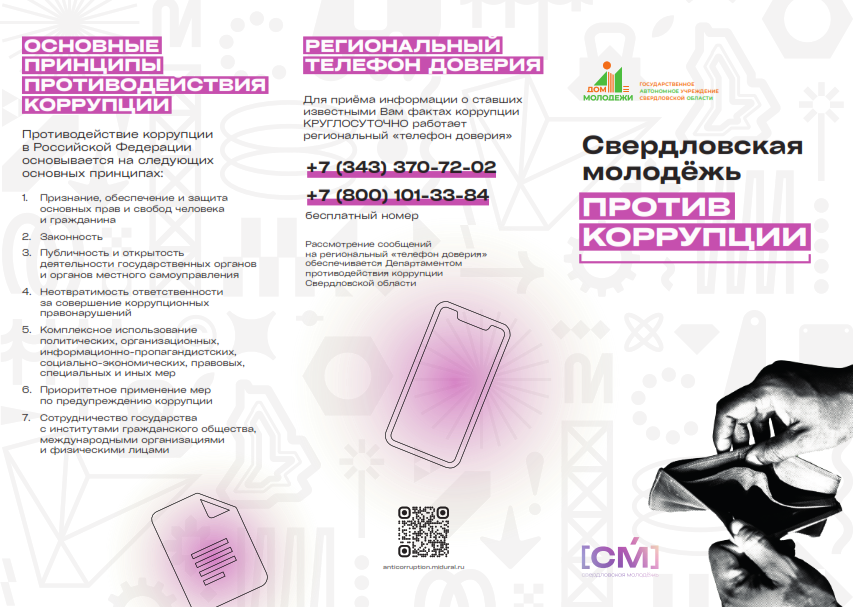 Государственное автономное учреждение Свердловской области «Дом молодёжи» в рамках реализации мер по профилактике коррупционных правонарушений разработал информационный буклет, посвященный противодействию коррупции.