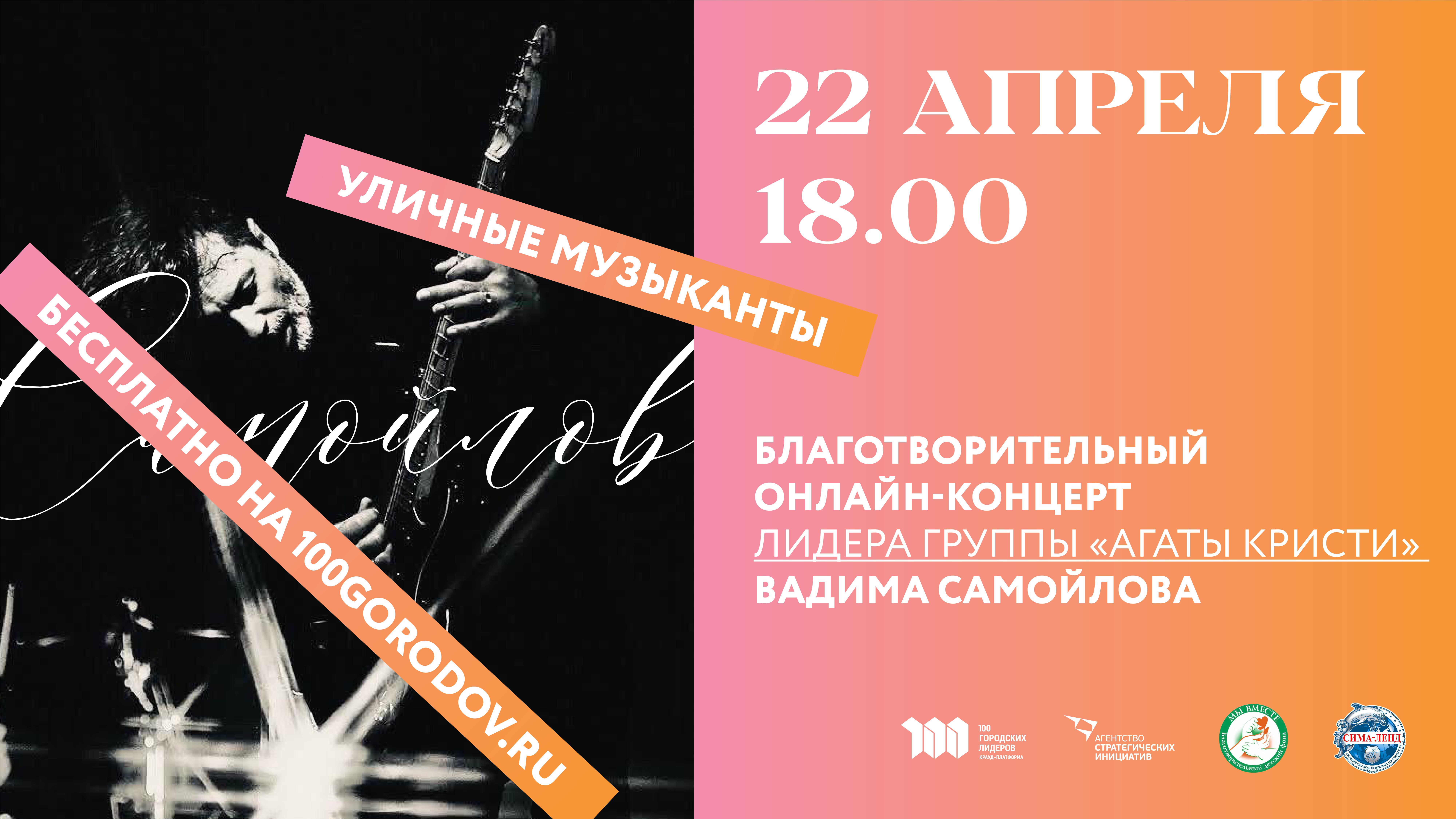 Трансляция начнётся в среду, 22 апреля, в 18:00 (время московское) на платформе 100gorodov.ru, предварительно требуется регистрация по ссылке: https://100gorodov.ru/streetmusic